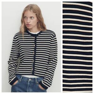 NWT. Massimo Dutti Navy Blue/Ecru Striped Gold-Toned Buttons Cardigan. Size XS.