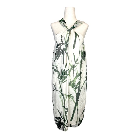 NWT Massimo Dutti Silk Bamboo Design Knot Detail Halter Knee Length Dress in Cream & Green