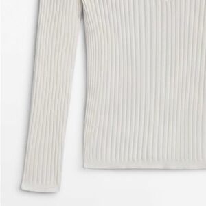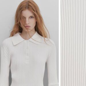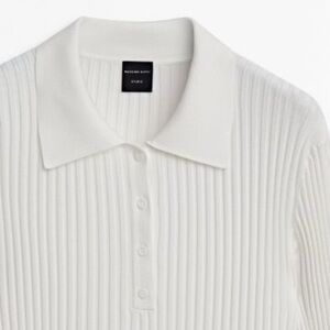 NWT. Massimo Dutti Studio Off White Fitted Ribbed Knit Polo Shirt with four-button placket fastening, ribbed fabric, long sleeves. Size M. Ref. 9116/953. Pit to pit 13-19" flat, shoulders 12,5-15,5", sleeves 23,5", length 24". BS1
