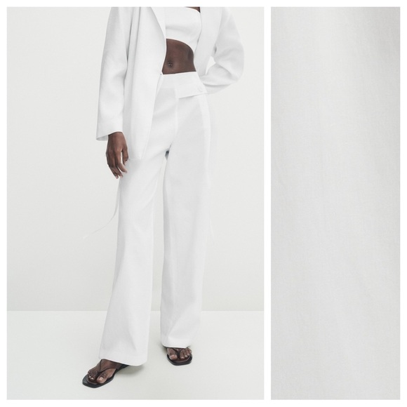 NWT. Massimo Dutti White Wide-Leg Waxed Linen Trousers with Buttoned Strip. Made of 100% linen fabric. Wide leg. Side zipper closure. One welt pocket on the back. Made in Portugal. Size 6. Ref. 5016/555. Waist 16" flat, rise 12,5", inseam 32". MD1