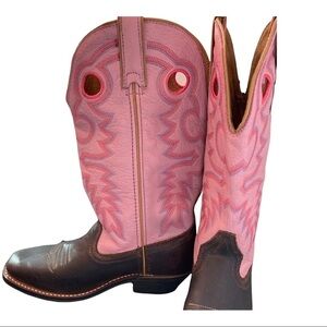 Cowgirl boots, pink leather upper and brown bottom
