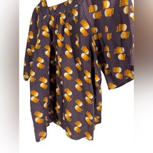 This boho blouse features a bold, graphic geometric vintage inspired brown pattern hand printed on 100% cotton, and tiny hand embroidered details dotting the front shapes. With a pretty square neckline and subtle bell sleeves, this top has a fit that's relaxed but flattering. Pair with denim for a casual look, or dress up with jewelry and your favorite sleek pants for a one-of-a-kind look.