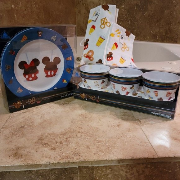 Brand New Disney Housewares Icon sets complete with 2 sets Total of 4 of Matching Disney Kitchen Towels All Bought separately but selling a one of a kind kitchen set NOT SOLD HERE ON poshmark!