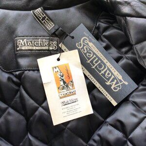 Brand new Matchless leather jacket, Size Medium. Retailed for $2,250. Matchless is a British motorcycle company, founded 1899. Zipped cuffs. Classic styling. Beautiful! Bought this as final sale and it's too big for me. Went back and bought same jacket in smaller size. Get compliments every time I wear it. This is a heavy and well-constructed jacket. It's SUPER cozy. Never, ever giving mine up!
