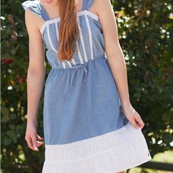 Classic chambray meets eyelet cotton and lace trim for a perfectly feminine dress that will impress.