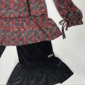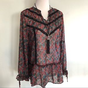 New with Tags! Matilda Jane semi-sheer holiday blouse from the holiday Choose Your Own Path collection. Chiffon holly print with swiss dot lace detail and flounce hem. Nice extra touch of ties at cuff. Sz Small. 100% Polyester