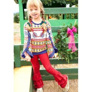 Matilda Jane's holiday ruffle sweater offers a blend of festive patterns and quality fabric, designed to keep young girls warm and stylish during the winter season.