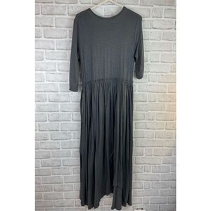 Flattering charcoal gray maxi dress with subtle high-low hem, v-neck, POCKETS, and tie waist. Another buttery soft cotton jersey dress you can dress up or down.