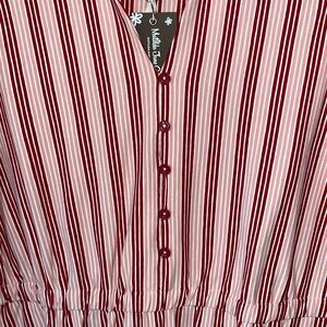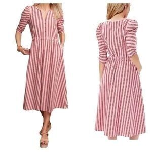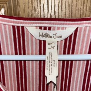 This dress is made by Matilda Jane. It’s the Heart to Heart red and pink striped midi dress. V-neckline with buttons, 2 pockets and 3/4 ruched sleeves. Size large and NWT. Smoke and pet free home.