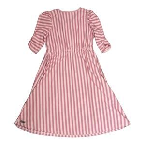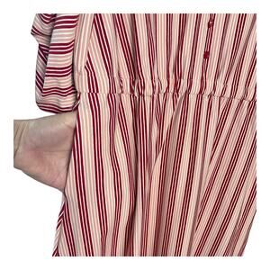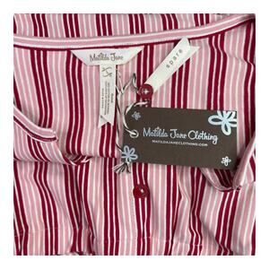 New with Tags Matilda Jane cotton knit midi dress in a charming red and pink stripe design. Features include a heart-to-heart v-neck with a button-up bodice, elastic waist, 3/4 length cinched sleeves, and convenient side pockets. Crafted for both comfort and feminine flair.