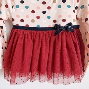 With a polka dot print knit bodice and a polka dot tulle skirt trimmed in velvet ribbon, Ronnie is the adorable holiday-ready top your girl needs to make this season the best ever. Who says you can’t twirl in a top just as you’d twirl in a dress?