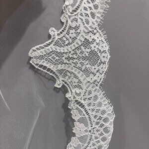 Matthew Christopher Couture Bridal, Adaline Chapel Veil, Style 9010C. Single layer veil with Chantilly lace beginning at fingertips and surrounding perimeter. Light Ivory/Off White. Got hemmed to 90". I never ended up wearing so it's brand new.