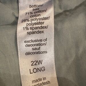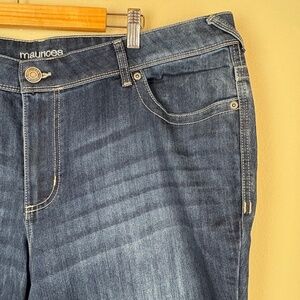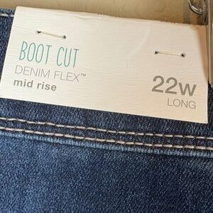 NWT Maurices Bootcut Denim Flex Mid Rise Cotton Blend Jeans; Size 22W Long; When lying flat, measures 21" waist, 12" rise, and 33" in length in-seam; Fabric and Care instructions shown in pictures; Slight white discoloration on bottom pant leg (shown in last picture)