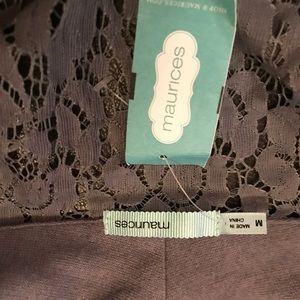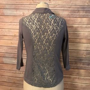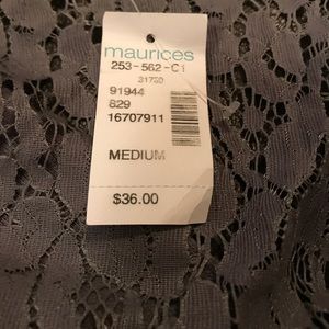 NWT Maurices cardigan. Size medium. Color gray. One button in front. Lace back. Quarter sleeves. Cotton and nylon. Measurements: chest 17”, length 20”, waist 15”.