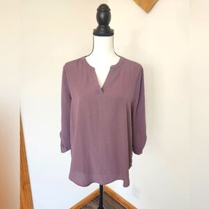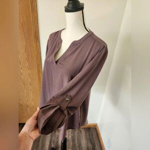 NWT Maurices Purple Relaxed Mandarin Collar Shirt, new with tags, size medium, pit to pit 20 inches, length 22 to 24 inches tapered, purple lilac, flowy, business, v neck, buttoned 3/4th sleeves, 100% polyester