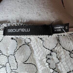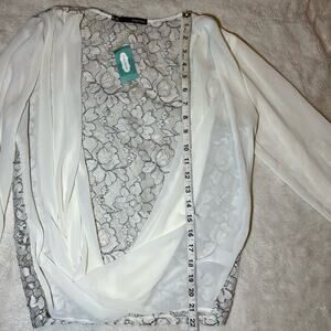 Maurices white draped-front blouse w/ a soft chiffon overlay and a floral lace back panel. long sleeves, plunging wrap-style front, and a flowy silhouette. Lightweight woven fabric with subtle stretch at the back. Modern feminine style ideal for layering, office outfits, or dressy casual looks