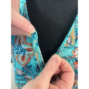 Brand new. Color is catamaran turquoise. Has hook closure on the front. Has tie at sleeves and on the side of the blouse. (Shown in pictures). Armpit to armpit laid flat measures about 19 inches.