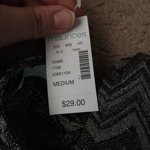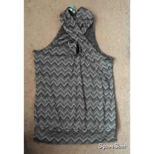 NWT Maurices black, gray, and silver metallic chevron cross front high-neck top with banded waist and key-hole front & back. Never worn, only tried on. Perfect for a holiday and/or New Years party with a black pencil skirt! Machine washable. Questions? Let me know!