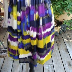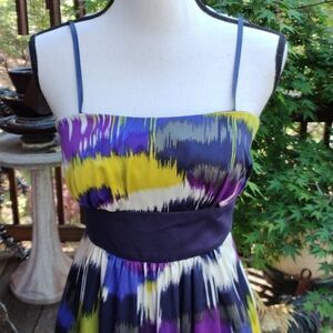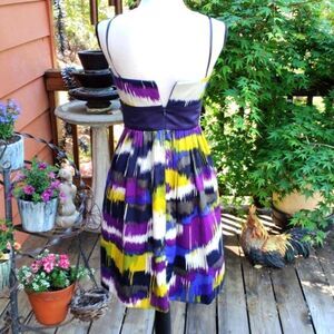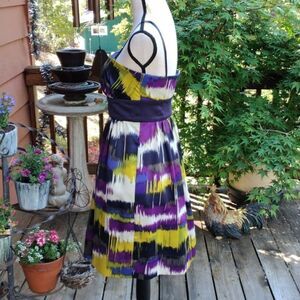NWT This satiny abstract print dress is a standout. There are satin straps that can be used if you prefer, or you may choose to be strapless. There is an adhesive strip to keep everything in place. Gathers at chest, wide band under chest. Supports here, built in bra. Gathered under waistband. Fully lined. Size 4 measures 34 at chest, 28 at waist, 44 at hips, 37 long from shoulder to hem. Stunning and satiny soft and NEW.