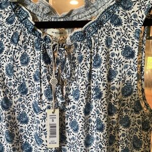 NWT Max Studio sleeveless sundress in blue and white pattern. Tie closure at neck. Dropped waist. Trim around neckline and skirt. Size Small.