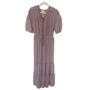 Exude effortless charm in this Max Studio geometric print maxi dress, crafted from lightweight crepe for a soft, flowy feel. Featuring a tie neckline, short puff sleeves, and tiered detailing, this piece blends boho elegance with cottagecore flair. Perfect for brunches, getaways, or relaxed summer and fall days.