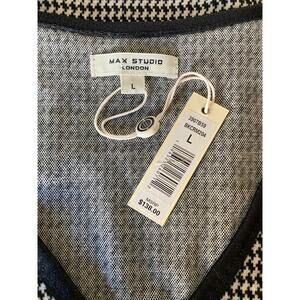 NWT Max Studio Hound's-tooth pattern black and white V-neck above knee mini dress, size large, slip on dress with front pockets, medium weight, wear as is but also looks great with top underneath & black boots, 66% polyester-30% rayon-4% spandex, machine wash/dry flat, MSRP $138