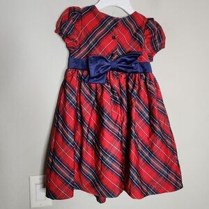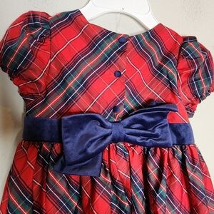 max studio kids red Christmas plaid short sleeve dress with blue velvet band at waist/bow at back.