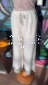 These linen blend pants are in an ecru color with taupe/ beige and black detailing along the side stripe and bottom cuff of the pants.