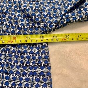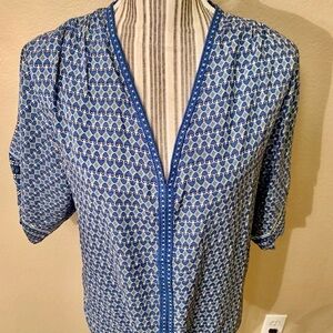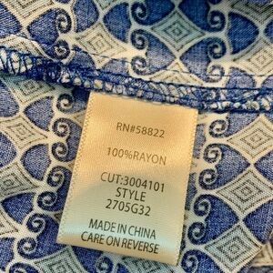 Top is 100% Rayon for a light flowy Boho fit. Short Sleeved in Shades of Blue, Aqua, and White in a Geometric Pattern.