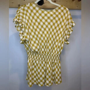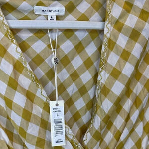 Max Studio Women's Smocked Waist Flutter Sleeve Blouse Size LARGE NWT! Retail: $88.00. Gold/Cream. Details: This plaid print blouse features a v-neckline, pretty flutter sleeves, and a smocked waist for figure hugging style.