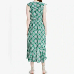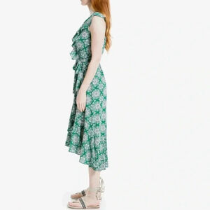 This is a NWT Max Studio wrap dress with a ruffle hem and a high-low skirt. It features a beautiful green print with a V- neckline, ruffle detail at the collar, semi cap and ruffle sleeve, same pattern belting, and a flowy bottom.