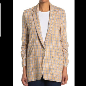 New with Tags yellow & blue plaid linen blend oversized Spring/Summer blazer with ruched sleeves.