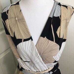 Max and Cleo Knit City Dress. Black, champange, and white print. Fitted skirt/bottom with shirred gathers at sides. Top is drape front, deep-v style. Very flattering dress that can be worn to the office with a blazer or a night out.