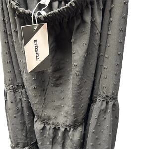 This is a brand new black maxi skirt in size small, featuring a pull-on style with an elastic waist. The skirt is long in length and has a 3-tiered design with lace accents. Made of polyester and rayon, it also includes embroidered details. The brand is Etosell and it is designed as a regular fit skirt.