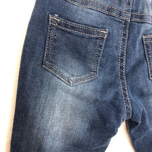 Dark skinny jeans with sandblasting on the front and back, full elastic waist, stretchy fabric, baby pants.