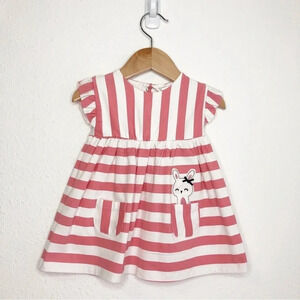 Pink and white stripe flutter sleeve dress, pockets on front with bunny rabbit appliqué, button back, stretchy cotton blend, baby girl dress.