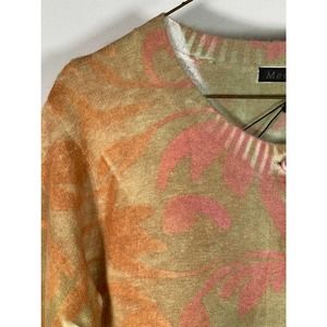 Pretty button front cardigan sweater with an abstract design in rusts, coral, gold and brown warm tones.