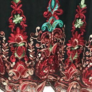 An elegant, boho-inspired min dress featuring all-around, elaborate floral and paisley embroidery and semi-sheer sleeves.