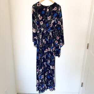 Bright florals call attention to a 70s inspired dress with flowy bell sleeves.