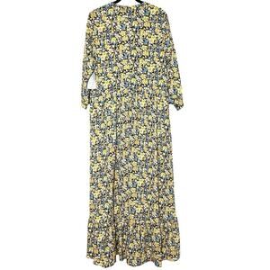 Melloday hi-low maxi length floral dress size XL. Retro floral pattern of blue and yellow with a black background. High neckline with front button closure. Hi-low hemline, 3/4 sleeves and hidden side pockets. 100% polyester and brand new with tags! Measurements: length (top of shoulder to hem)-52 inches in front to 59 inches in back. Chest (underarm to underarm)- 22 inches and Waist ( laying down flat)- 20 inches.