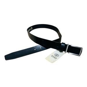 New with tags. Sleek black leather belt featuring a stylish silver buckle. Perfect for any outfit.