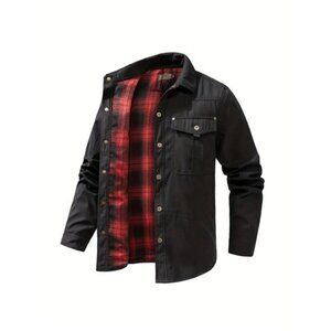 Stay warm and stylish with this versatile men's black flannel-lined shirt jacket, often called a "shacket." Perfect for fall and winter layering, this rugged yet comfortable piece features a durable black outer shell and a cozy red plaid flannel lining for ultimate warmth. It boasts a classic collared design, full-button front closure, and practical chest pockets (one with a flap closure) with snap buttons, adding a touch of workwear-inspired style. Ideal for outdoor activities, casual wear, or adding an extra layer of warmth on cooler days. This quilted shacket is a must-have for your cold-weather wardrobe. (Approximate chest measurement for size L: 44-46 inches).