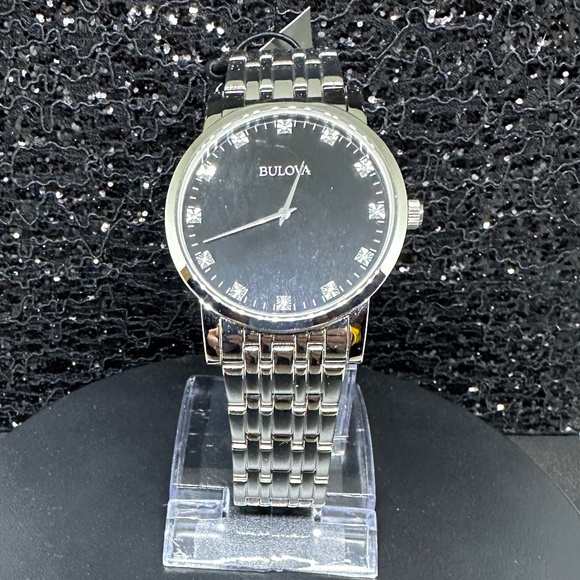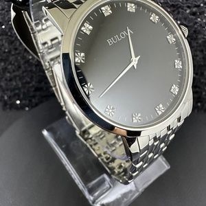 This is a brand new black-faced Bulova watch with tags. It has gorgeous diamonds at each hour and is surrounded by a beautiful silver bezel attached to a stunning silver band.