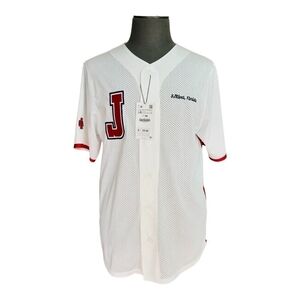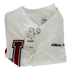 Discover the new NWT Men's Jersey ZARA White Perforated Shirt, inspired by the scenic St. Johns River, Florida. This athletic #ShortSleeve top features a sharp #ButtonFront design. Available in sizes L-XL (Full length: 33”, Pit to pit: 25”) and S-M (Full length: 31.5”, Pit to pit: 22”). Made from 100% polyester, this jersey combines style with performance. Its Dri-FIT® technology wicks moisture, ensuring you stay dry and comfortable. The breathable perforated fabric enhances #comfort and focus. Adorned with embroidered “J” and “SJ River, Florida” on the front, plus "St. Johns River, Florida" patches on the sleeves, this shirt captures the spirit of Florida.