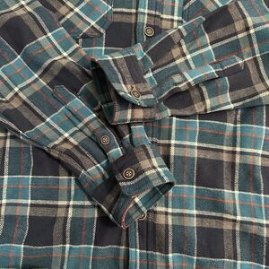 Men’s blue plaid flannel shirt features button-up front and chest pockets. Perfect for casual or work wear. Material is slightly heavier (with thermal lining) making a perfect shacket material.