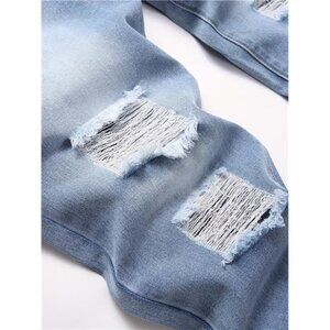 New with tags! These light wash men's jeans are a celestial style statement. Perfect for those who love a unique and casual look, these jeans feature a playful star print on the thighs and lower legs. The light blue denim is enhanced with distressed rips and frayed details for a cool, vintage feel. Made from a comfortable and durable denim blend, they offer a great fit for everyday wear. The straight-leg cut and classic five-pocket design ensure these jeans are both fashionable and functional. Pair them with a graphic tee or hoodie for an effortlessly cool outfit. (Typical waist measurements for size 34: 34"-35").