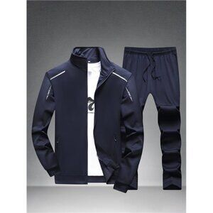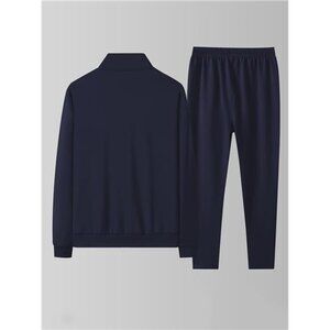 New with tags! This lightweight men's tracksuit is perfect for an active lifestyle or for a casual, sporty look. The set includes a full-zip jacket with a stand-up collar, two side pockets, and stylish white stripe details on the shoulders and arms. The matching pants feature an elastic waistband with a drawstring for a comfortable and adjustable fit, along with two side pockets. Made from a breathable, smooth fabric, this set is ideal for running, gym sessions, or just a comfortable day out. The classic navy blue color with white accents is timeless and easy to style.