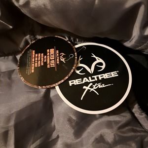New with tags - REALTREE Men's Edge XL Insulated Water Repellent Reversible Vest. Forest Camo on one side and Gray-Silver on the reverside side with reversible zipper and cord tighteners at the bottom to seal in the warmth.