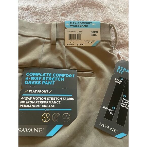 NWT Men’s SAVANE Max Comfort Waist Band 4 Way Stretch Pants Size 38W 30 L Taupe