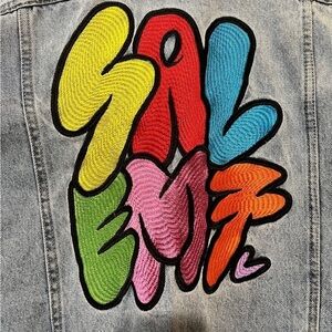 The Salem7 men’s denim jacket in size XL is a trendy and stylish piece, new with tags. This light blue wash denim jacket features an embroidered neon Salem7 logo patch on the back, giving it a distinctive look. The jacket includes dual button-closure chest pockets, a standard fold-over collar, and button-up closure with neon buttons and the Salem7 logo. Custom Salem7 hardware is present throughout, adding to its unique appeal.